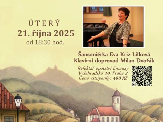 Vystoupí šansoniérka Eva Kriz-Lifková. Klavírní doprovod Milan Dvořák.